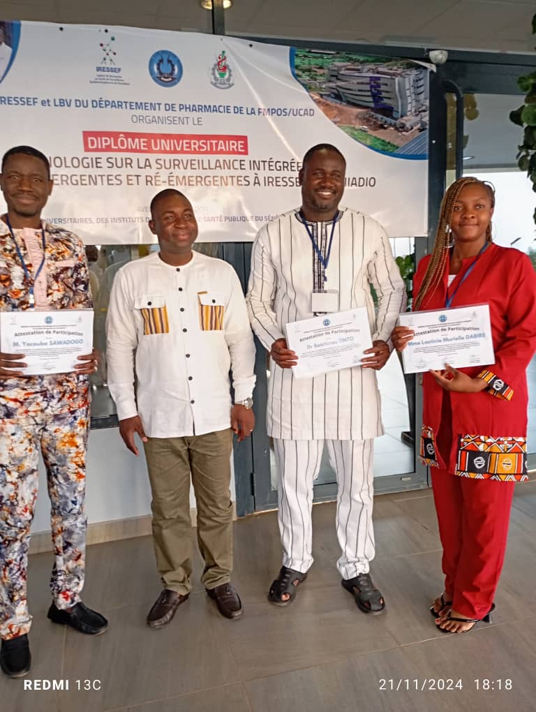 Du 11 au 22 novembre 2024, le Laboratoire de Pathogènes Emergents et Réémergents (LaPathER) a eu l’honneur de participer au Diplôme Universitaire (DU) pilote de Biologie pour la surveillance intégrée des maladies émergentes et réémergentes, organisé par l’IRESSEF au Sénégal. Cette formation, coorganisée avec le Laboratoire de Bactériologie-Virologie Pharmaceutique de la FMPOS de l’Université Cheikh Anta Diop de Dakar (UCAD), a réuni 23 participants issus de 7 pays africains, témoignant de son envergure panafricaine.